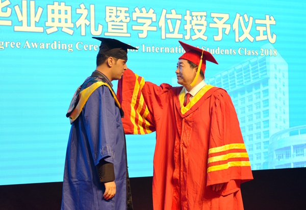 教务处副处长易和平、研究生院副院长屈文涛分别宣读了获得学士学位、硕士学位的国际学生名单。学生工作处副处长齐仲锋、国际教育学院院长董皓分别为2018届优秀国际学生毕业生、国际校友理事颁发了证书和聘书。