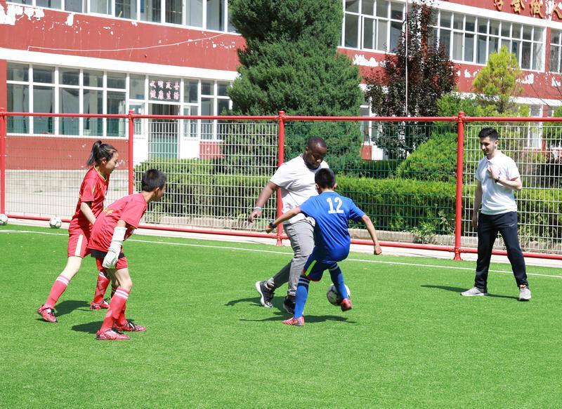 在直罗小学,留学生们为小学生们带来了有趣生动的英语口语课。实践教学活动是“感知中国”活动重要组成部分,在互动课堂上,小学生们与来自不同国家的留学生互动交流,来自马来西亚的咏翰分别用中文、英文、马来西亚语给小学生们教了生日祝福歌,来自哈萨克斯坦的小云用图画、猜谜游戏为小学生们上了一堂生动活泼的英语课。有趣的英语课堂激发了小学生学习英语的热情和浓厚的兴趣,课堂气氛热烈,同学们发言踊跃,一节课下来小学生们意犹未尽。英语课堂外,以“传播快乐足球”为主题的足球互动活动,留学生与小学生们开展了一场足球友谊赛。场上,参赛队员们齐心协力,奋勇拼搏。带球、护球、传球、射球,动作娴熟,拼劲十足。就这样,初次来到直罗小学的留学生们感受到了当地的风土人情,并对接下来与孩子们的相遇充满了期待。活动中,西安石油大学专程为直罗小学带去了50本捐赠图书和5个崭新足球。