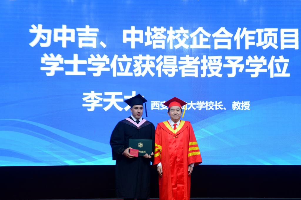随后,2023届中吉、中塔校企合作项目来华留学本科生毕业典礼暨学士学位授予仪式在雁塔校区会议中心学术报告厅举行。李天太、孟向东、吉尔吉斯斯坦驻华大使馆三秘乔罗娃·卡米拉出席典礼。典礼由张荣军主持。